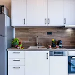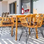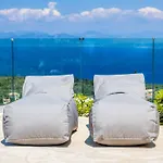 Η βεράντα βλέπει στη θάλασσα. Οι εγκαταστάσεις παραλίας περιλαμβάνουν ξαπλώστρες και παρασόλια.